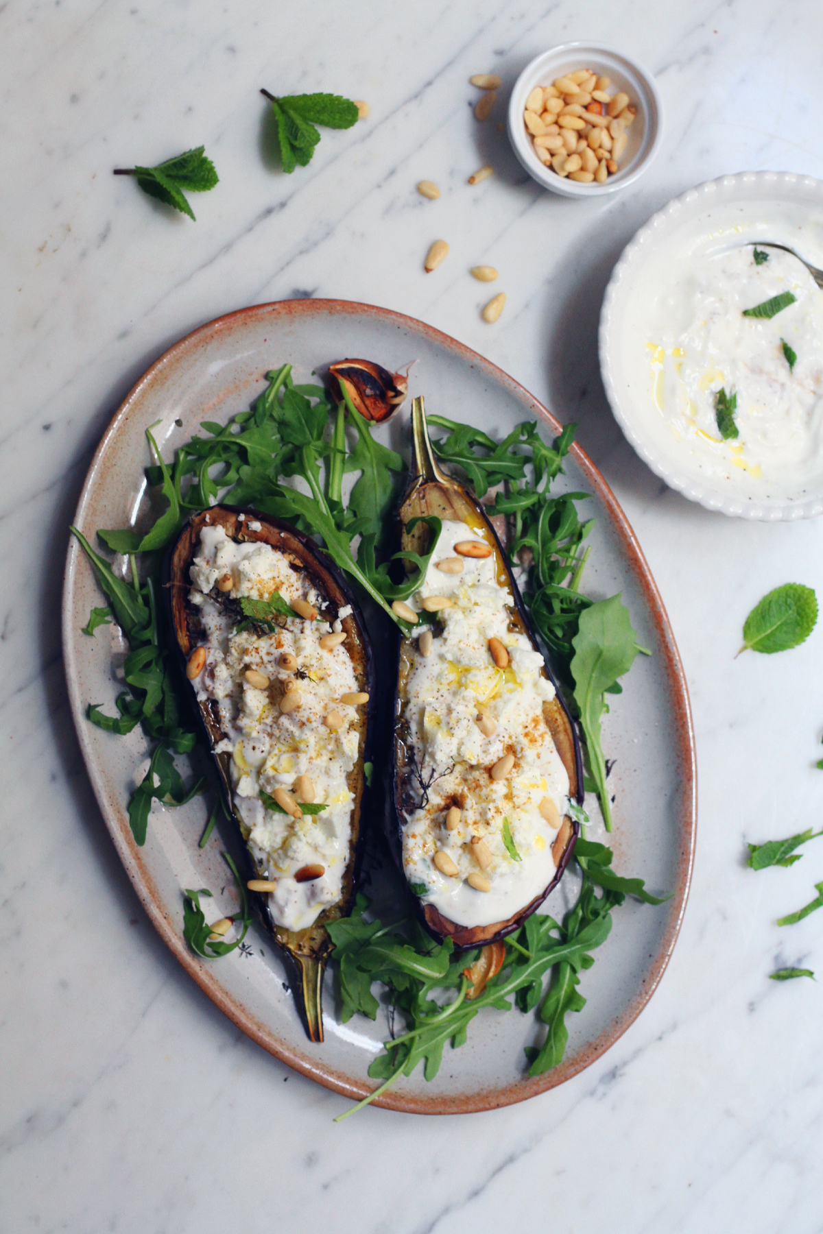 Mélanger un yaourt grec avec un filet d’huile d’olive et la feta émiettée puis le quart du citron confit couper en tout petits morceaux (attention le citron confit c’est très fort, si vous n’aimez pas vous pouvez en mettre moins encore ou simplement mettre un filet de jus de citron frais et ses zestes). Poivrer, ciseler quelques feuilles de menthe puis disposer cette sauce sur les aubergines rôties. Ajouter le cumin parsemé et les pignons de pin.