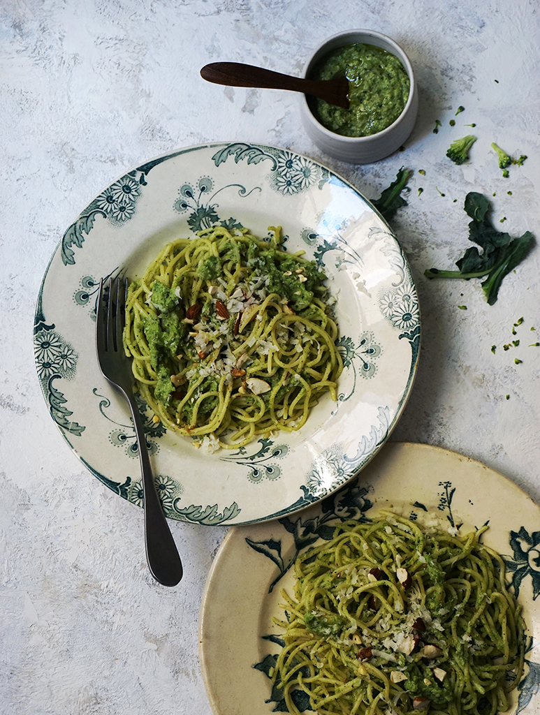 Mélangez le pesto avec les pâtes cuites et savourez parsemé d’amandes concassées et de parmesan râpé !